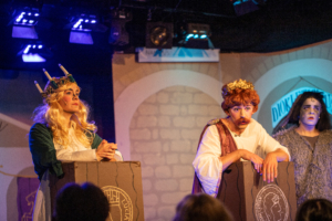 Vi kastas rakt in i Syrakusa, där en maktgalen romersk kejsare och hans nervöst lojale general oroar sig över den snabbt växande kristendomen. Komiken är skarp och replikerna sitter, men redan efter några scener blir det tydligt att den sammanhängande berättelsen kommer i andra hand. Skratten ekar i publiken, men förvirringen följer tätt därefter när scenerna avlöser varandra utan att riktigt hänga ihop.