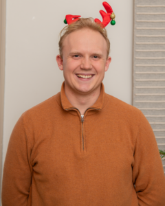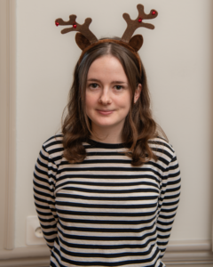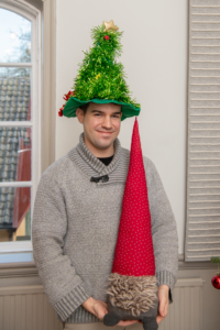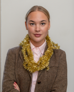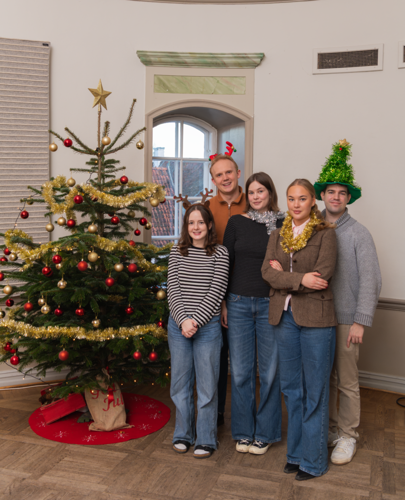 Det verkar inte som att presidiet tycker det. Julpyntet som vi har tagit med oss till fotograferingen tar de nämligen på sig direkt, trots att det inte kommer tas några bilder förrän senare. Julgransglitter och renhorn pryder nu de fem heltidare som bjuder på te och slår sig ned på andra sidan bordet.