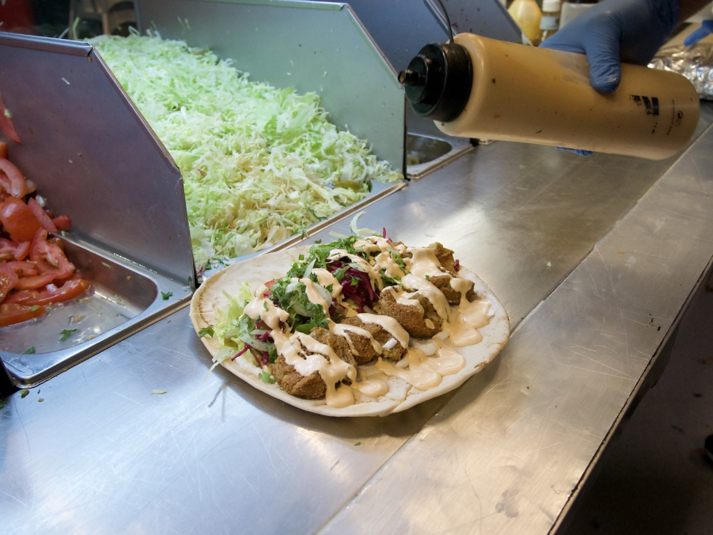 Efter intervjun insisterar Omar på att få bjuda på en falafel. Jag frågar vad som är den perfekta falafelbeställningen, varpå han svarar att såsen är det viktigaste. I Irak är det mangosås som gäller.