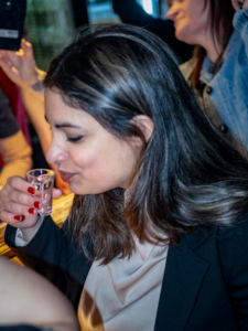 Efteråt vill alla ta bild med partiledaren. Nooshi ler för kamerorna och sätter sedan sikte på baren. En kille dyker upp och vill bjuda Nooshi på shots. Hon tackar artigt ja och ett gäng Minttu-shots beställs in. Shotglasen töms och kvällens högsta jubel ekar mot väggarna.