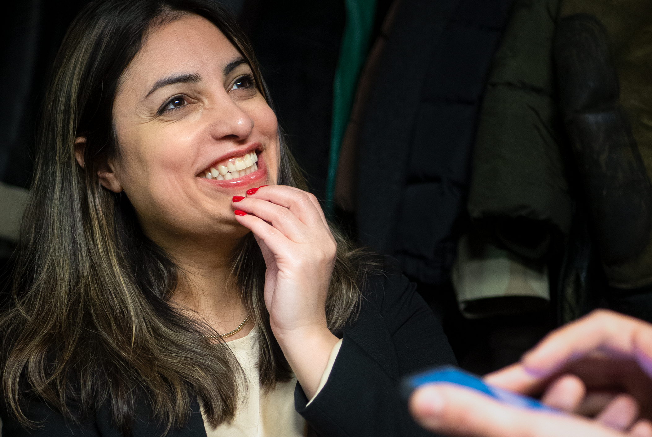 Efteråt vill alla ta bild med partiledaren. Nooshi ler för kamerorna och sätter sedan sikte på baren. En kille dyker upp och vill bjuda Nooshi på shots. Hon tackar artigt ja och ett gäng Minttu-shots beställs in. Shotglasen töms och kvällens högsta jubel ekar mot väggarna.