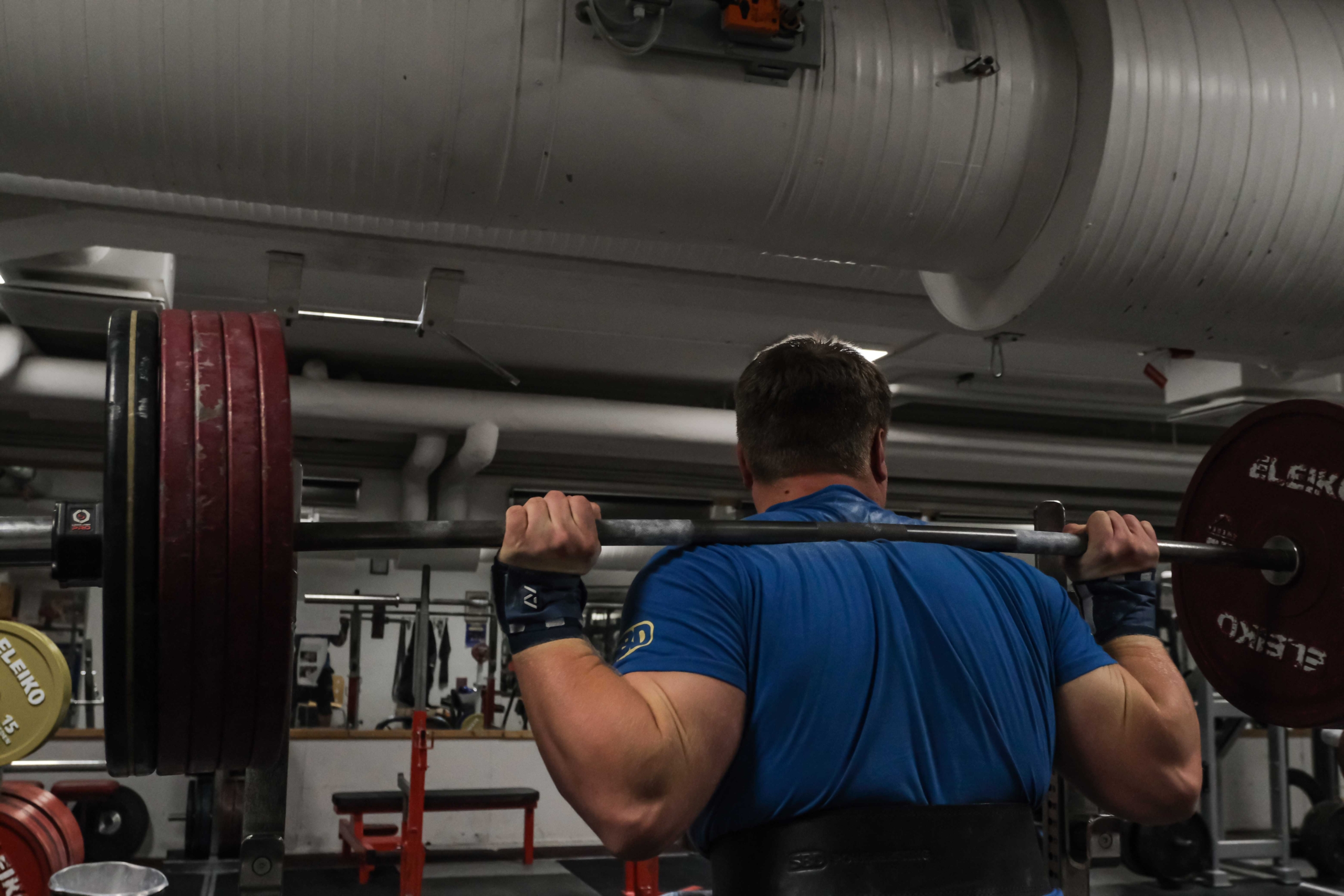 Han lastar på vikter, kör ett set, pausar, ökar vikten och repeterar. När vi skiljs åt har han precis ställt upp sin telefon för att filma ett par set till sin coach för att få teknisk feedback.