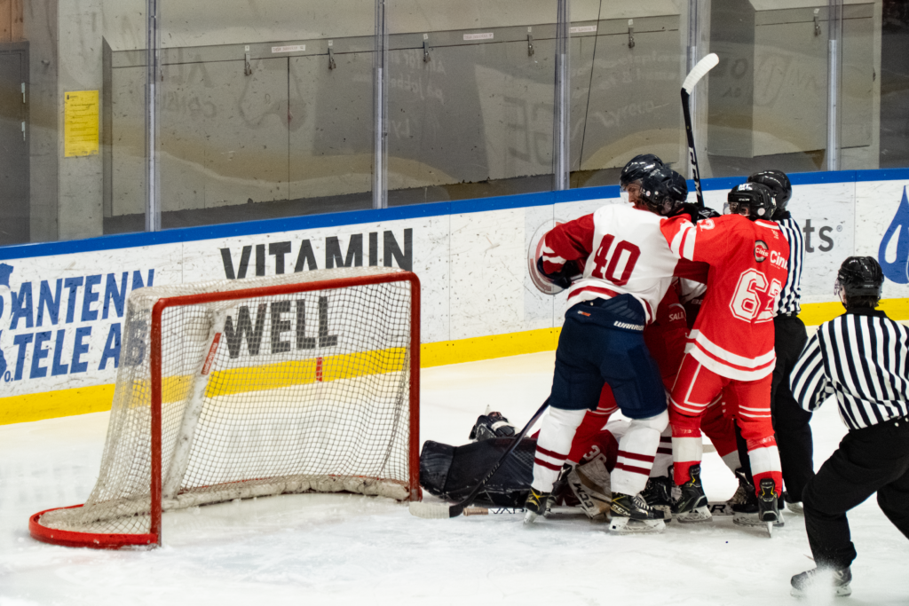 Två minuter senare är Ludvig Netteryd inblandad igen när han assisterar Daniel Stjernkvist som utökar ledningen till 2-0. Resultatet står sig till paus, men först ska ett slagsmål mellan i stort sett alla utespelare på plan utbryta. Jublet på läktaren är nästan större än vid målfirandet, och fem gripar och tre Uppsalaspelare visas ut och får börja nästa period i båset.