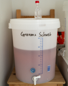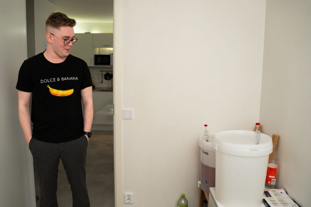 Axel brygger även eget vin – ännu ett val som präglats av både intresse och ekonomi. Det började när han och en kompis bestämde sig för att testa att göra vin av energidryck. De lyckades till slut, sedan dess har Axel fortsatt med att brygga hemma, men numera utan energidrycken. I ett rum mittemot köket visar Axel Lund oss jordgubbsvinet som kommer att vara redo att dricka i tid till Valborg.