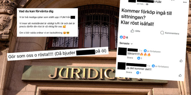 Två av de nyvalda ledamöterna i Juridiska föreningens fullmäktige (FUM) utlovade i ett Facebook-evenemang att alla som röstar på dem ska bjudas på tacksittning. JF:s ordförande Sofia Åhman vill inte fördöma kampanjmetoden.